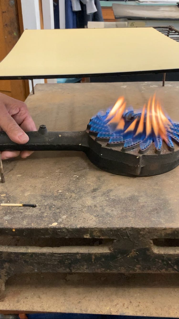 Firstly, the metal plate is prepared for work. Sharp edges are filed down, blemishes polished out, and the surface carefully cleaned to remove the slightest trace of grease. It is then heated on a hotplate, and a thin layer of wax, known as a ground, is rolled over the surface. Running a flame over this wax ground hardens the surface further, and also blackens it, which is useful for the next stage, as it increases the visual contrast between the wax and the exposed metal.