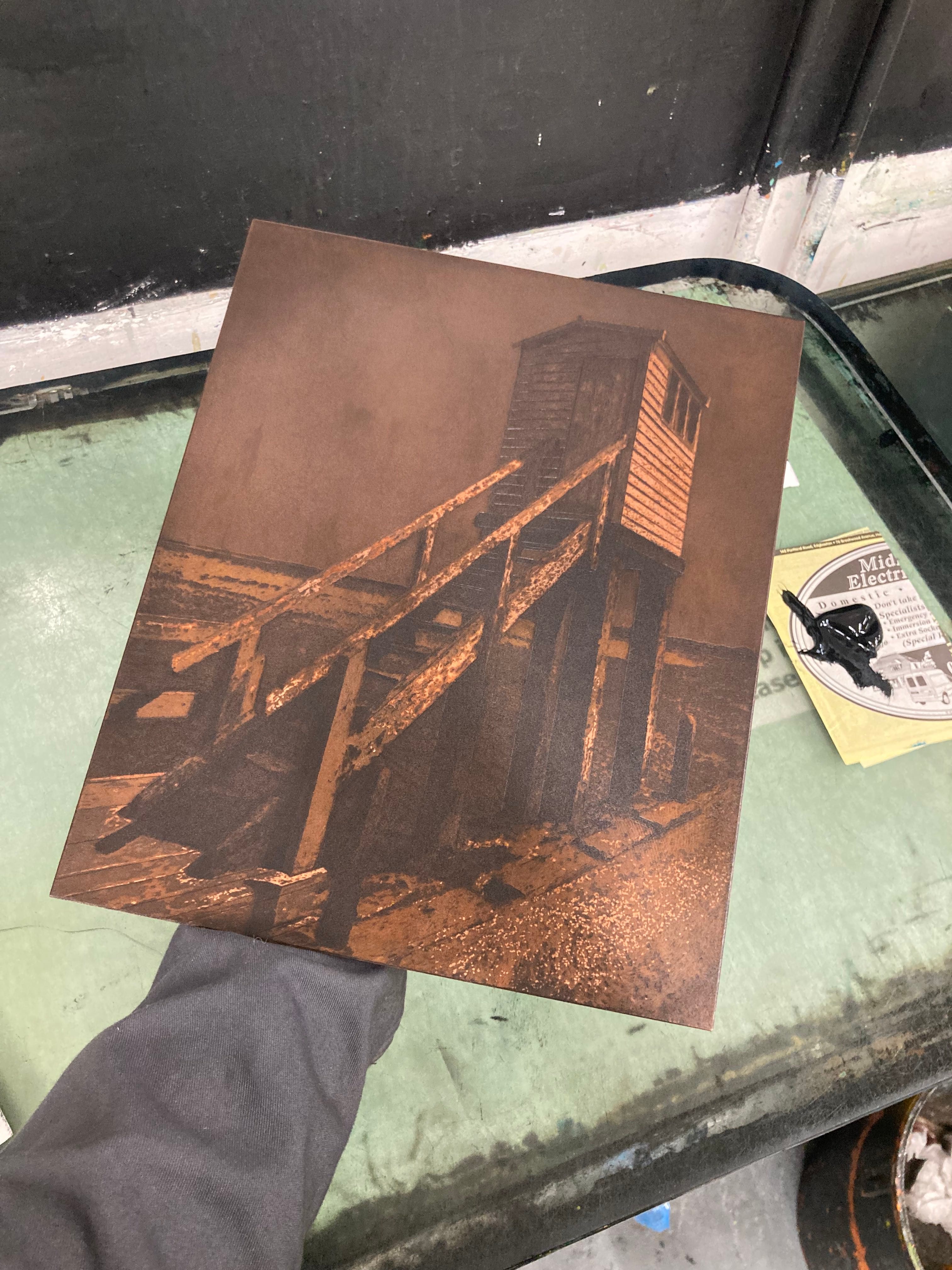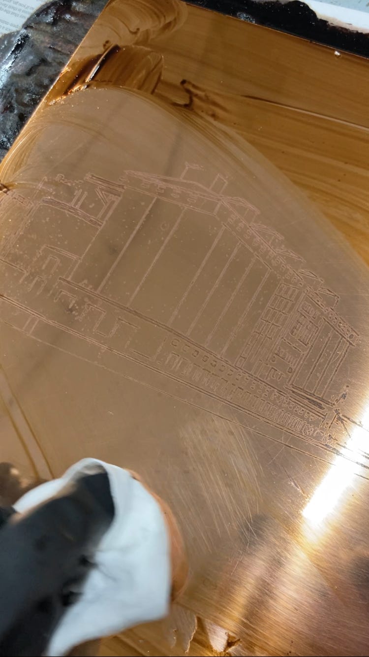 Finally, when all dunkings in acid are complete, the gloopy varnish is cleaned off the plate, and it’s ready to be inked up. For the first time, you can see all the exposed metal, and get a sense of whether it has all been worth it…