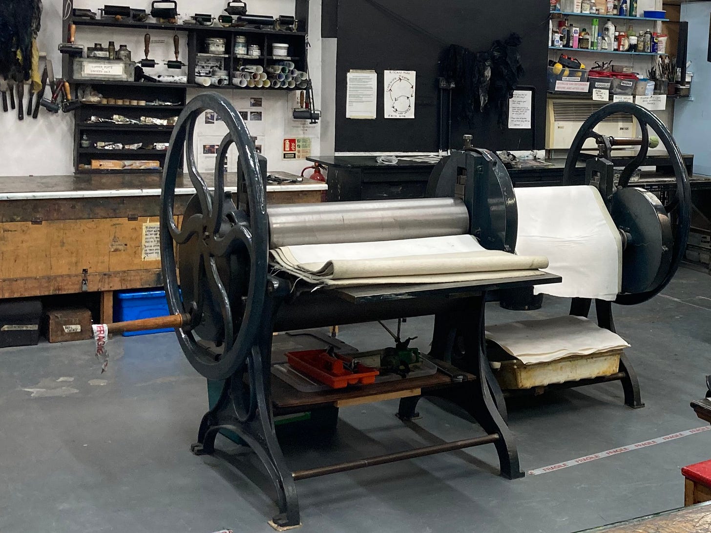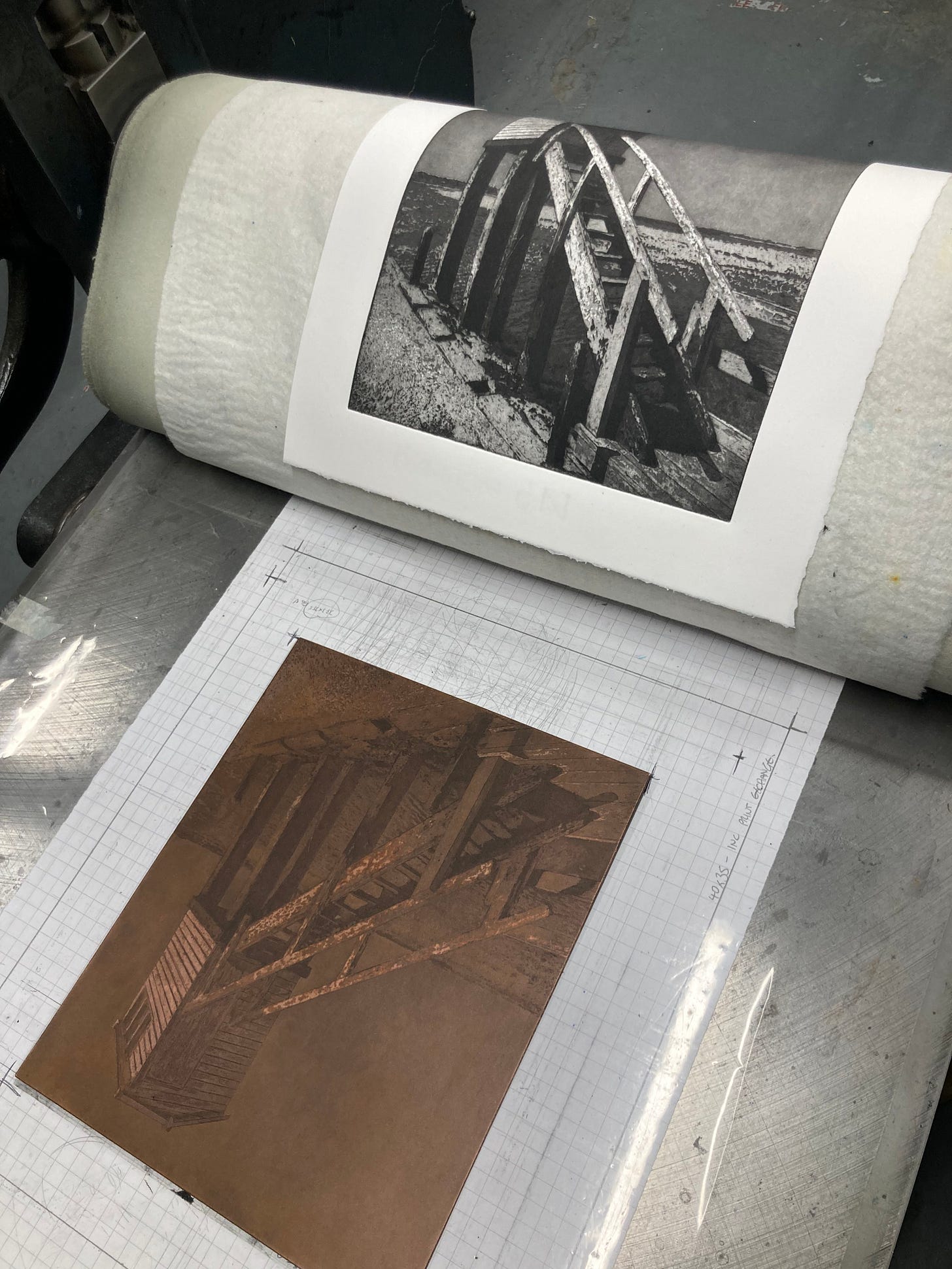 Inking up and printing. A thin layer of ink is rubbed across the surface. Using a piece of scrim (a very flat textile), you use a circular scrubbing motion to both push the ink into the bitten lines, but also to remove the excess from the surface. Meanwhile, thick papers are left to soak in water, to make them soft and pliable. They are then blotted dry, and carefully positioned over the plate, before being run through the etching press.