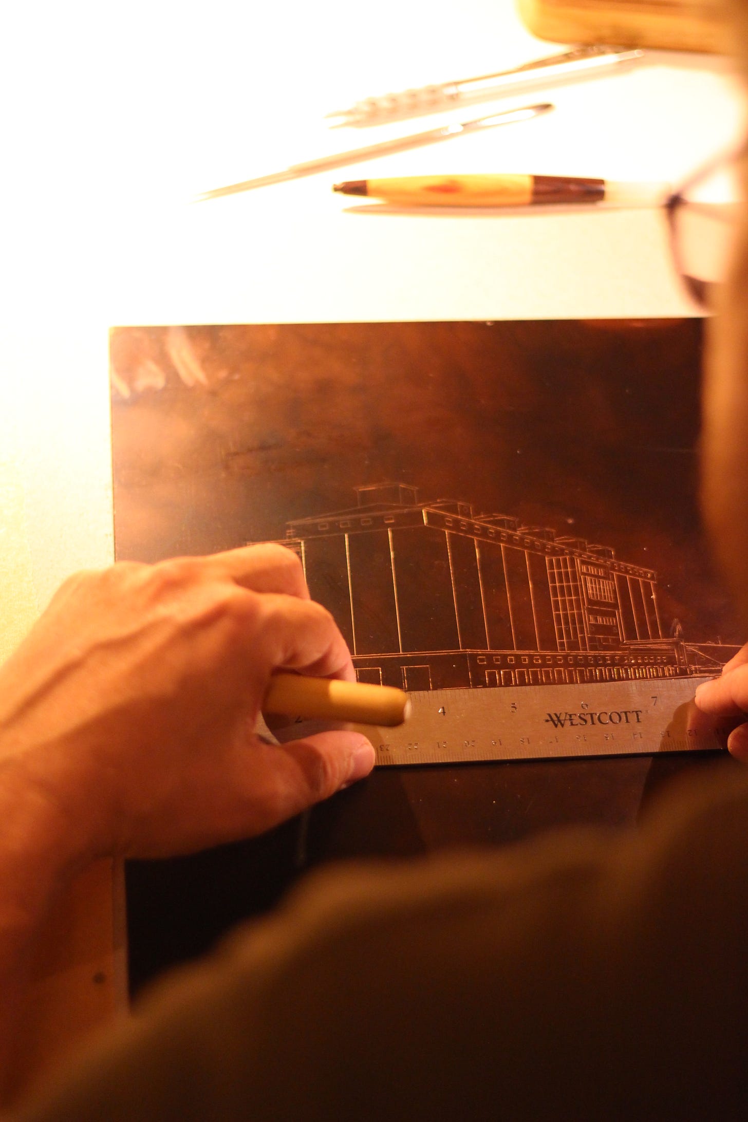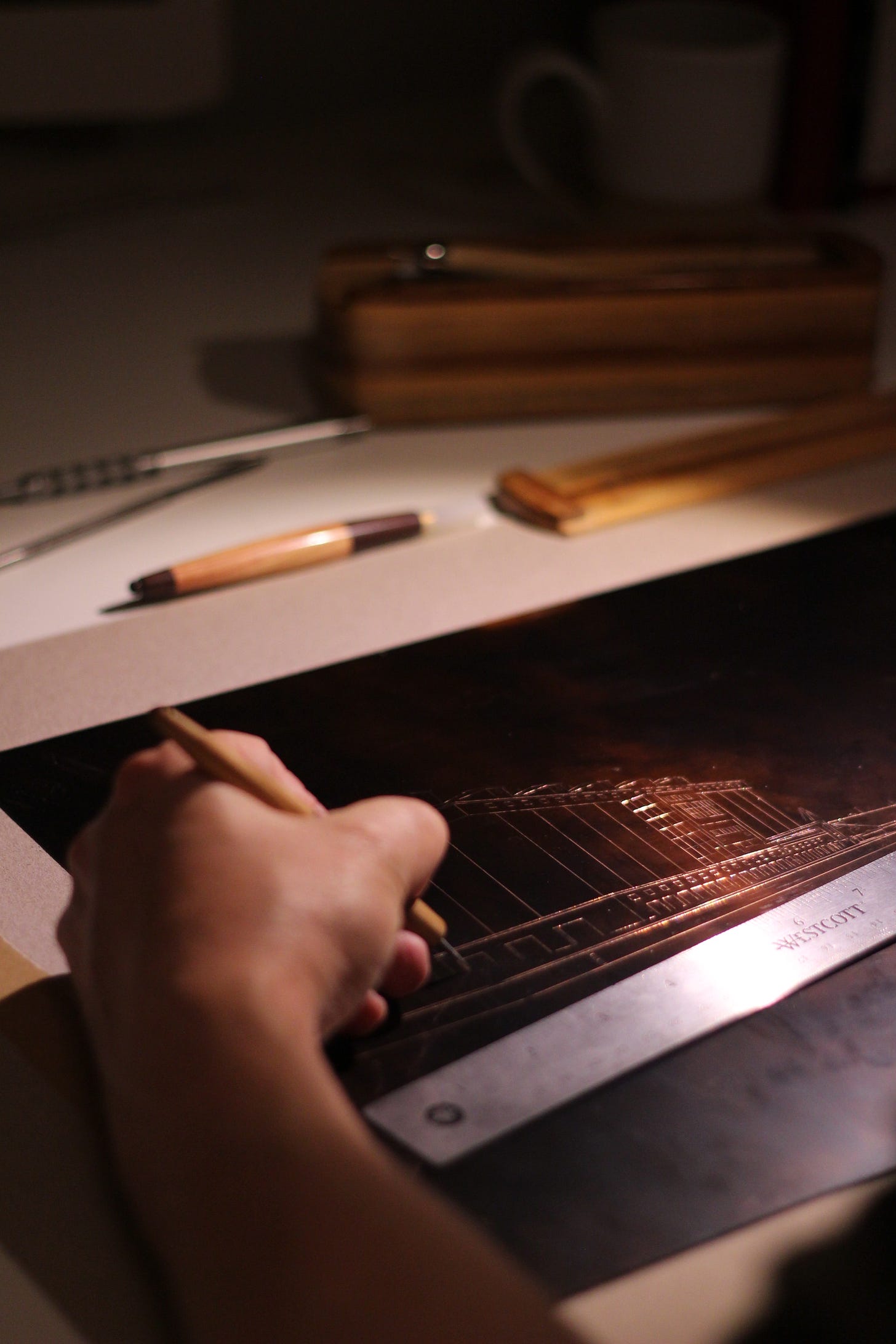 Some have mistaken my process as being mechanical/photographic. While there are ways of developing photographs on metal (this is known as photogravure) that is a very different process. My images are entirely hand-drawn, and as result, it’s incredibly laborious. This is basically drawing in metal, via acid.